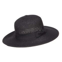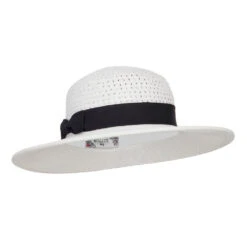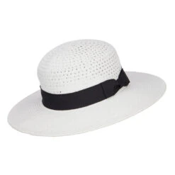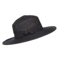 A black grosgrain ribbon hat band is accented around the crown.