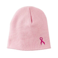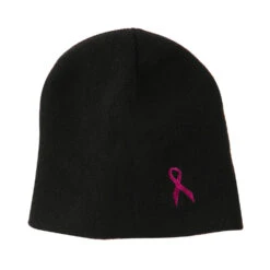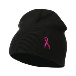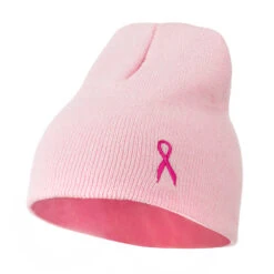 Our ribbon short beanie hat is great for supporting Breast Cancer awareness campaigns.