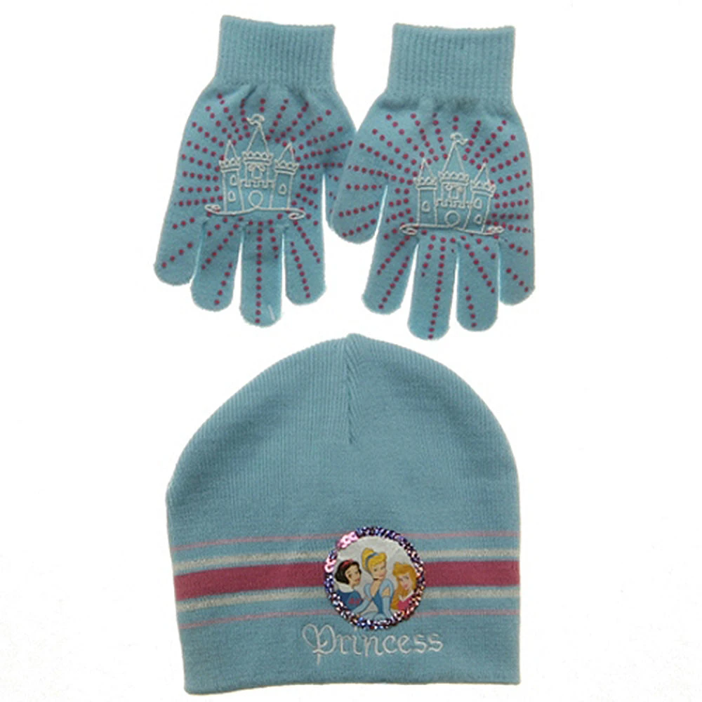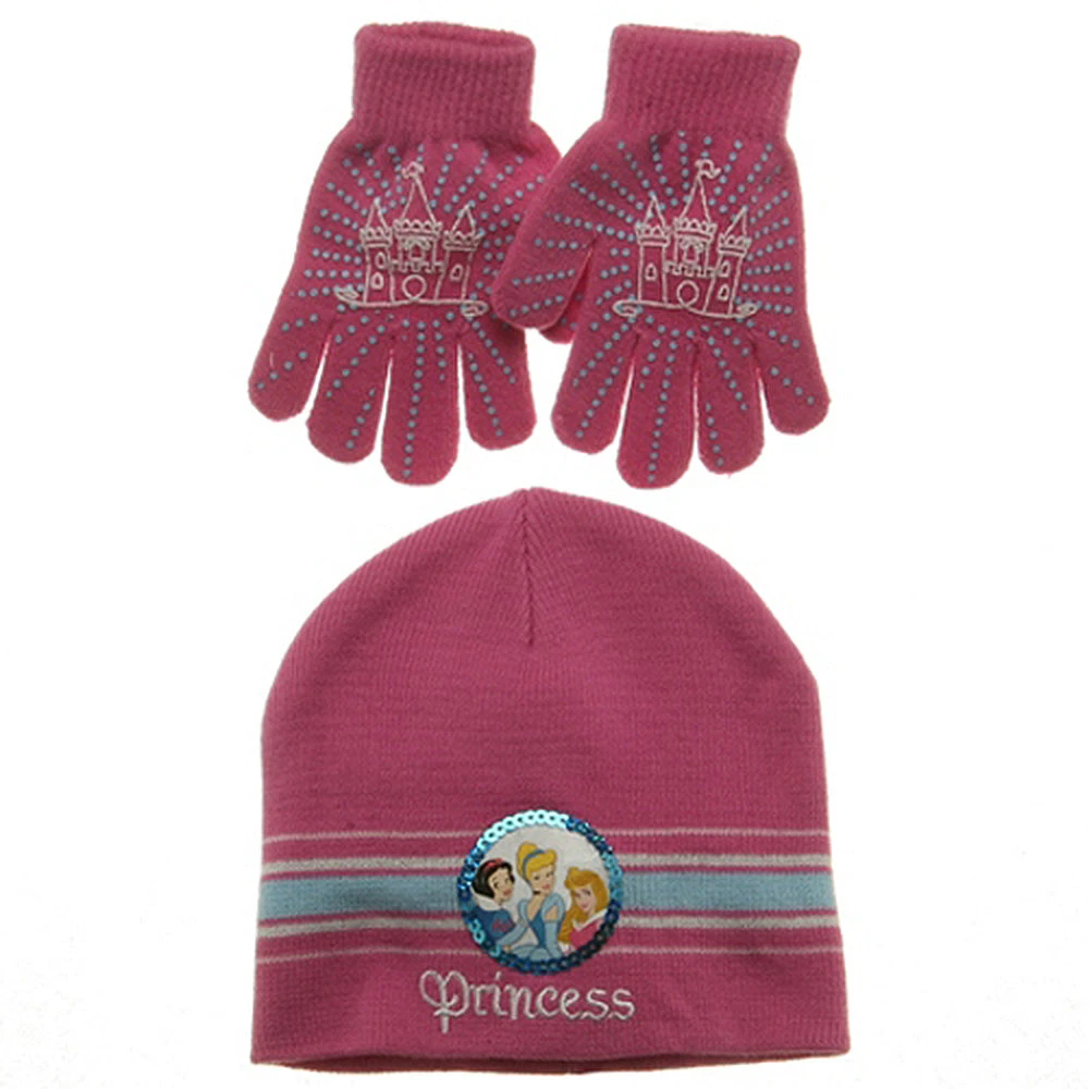 Make sure your little princess stays bundled this winter season in style with our Disney Princess hat and glove set. Made from 100% fluffy acrylic, this set features a stretchy beanie measuring 8 inches deep and wide, with a colorful princess emblem outlined in shiny sequins. Sure to please your little princess. Also included with this set are textured gloves measuring 6 inches long and 4 inches wide. Ideal for ages 3-7 years.