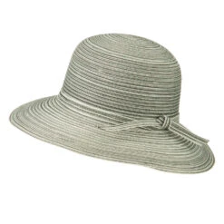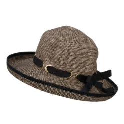 A self tie ribbon band is accented around the crown.